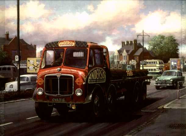 Halfway through its production life (1948-61) the A.E.C. Mammoth Major began to appear with concealed radiator cabs, although still identical under the skin. Andersons of Newhouse had many A.E.C. eight-wheelers and this example is seen in the suburbs of Birmingham with a load of steel bar.